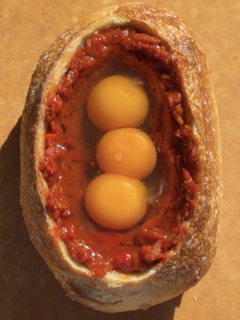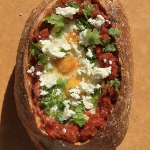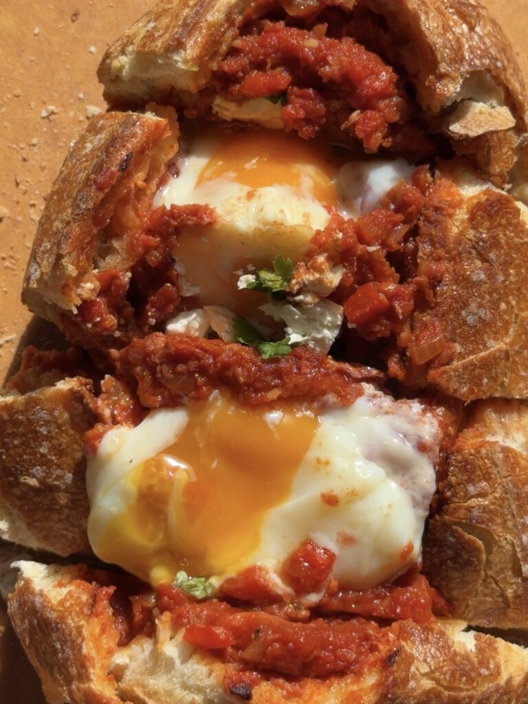 Line the Walls: Spread the shakshuka mixture up the inner walls of the bread before adding the eggs. This creates a barrier that helps prevent the bread from getting too soggy and ensures flavor in every bite.